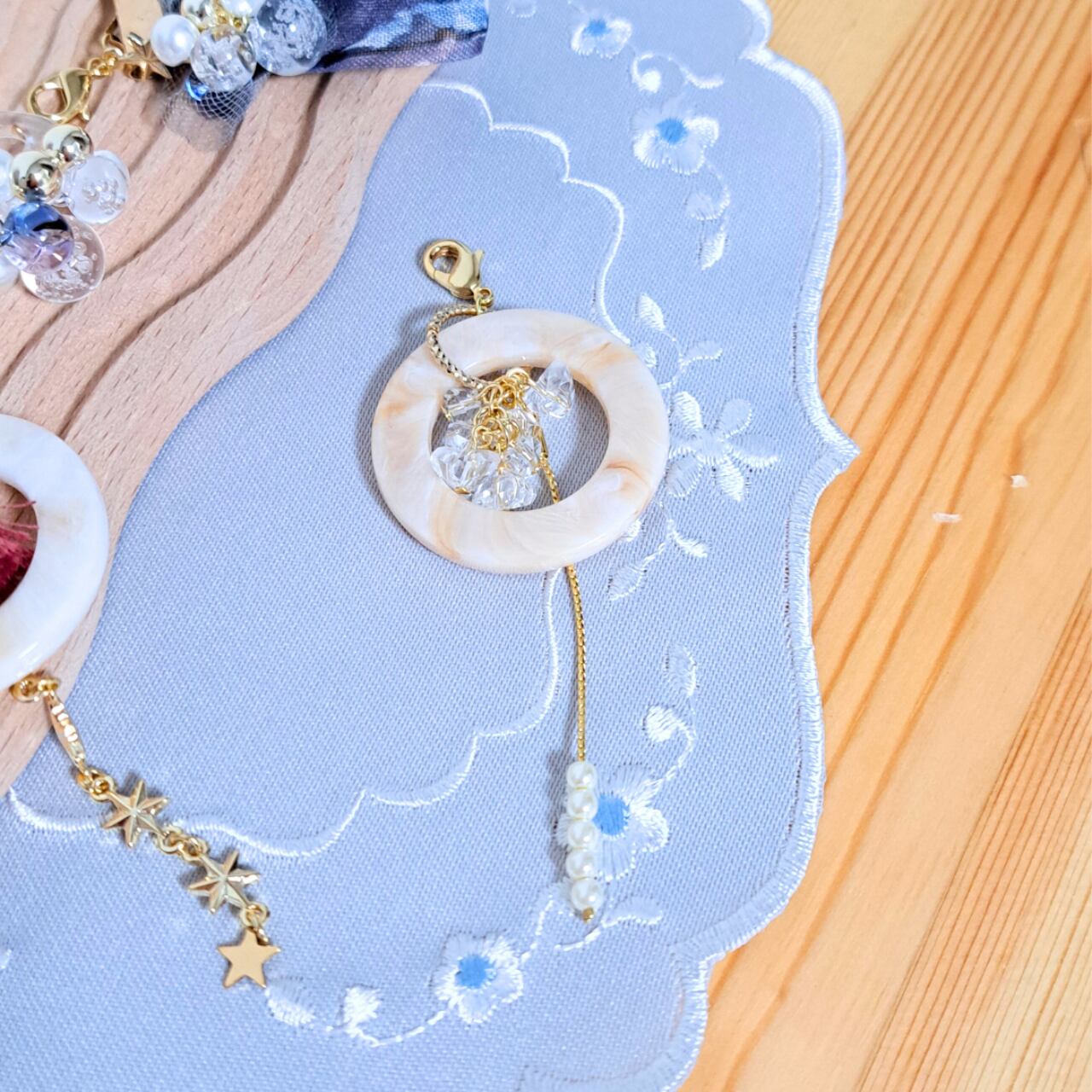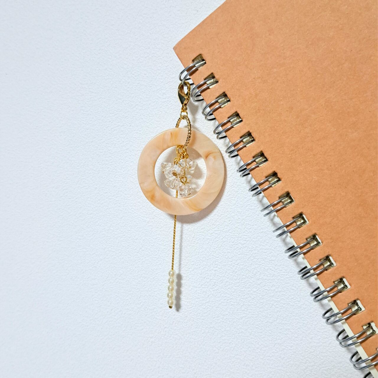 柔らかなベージュのリングに、透明感あふれるクリアビーズを合わせた手帳チャームです。